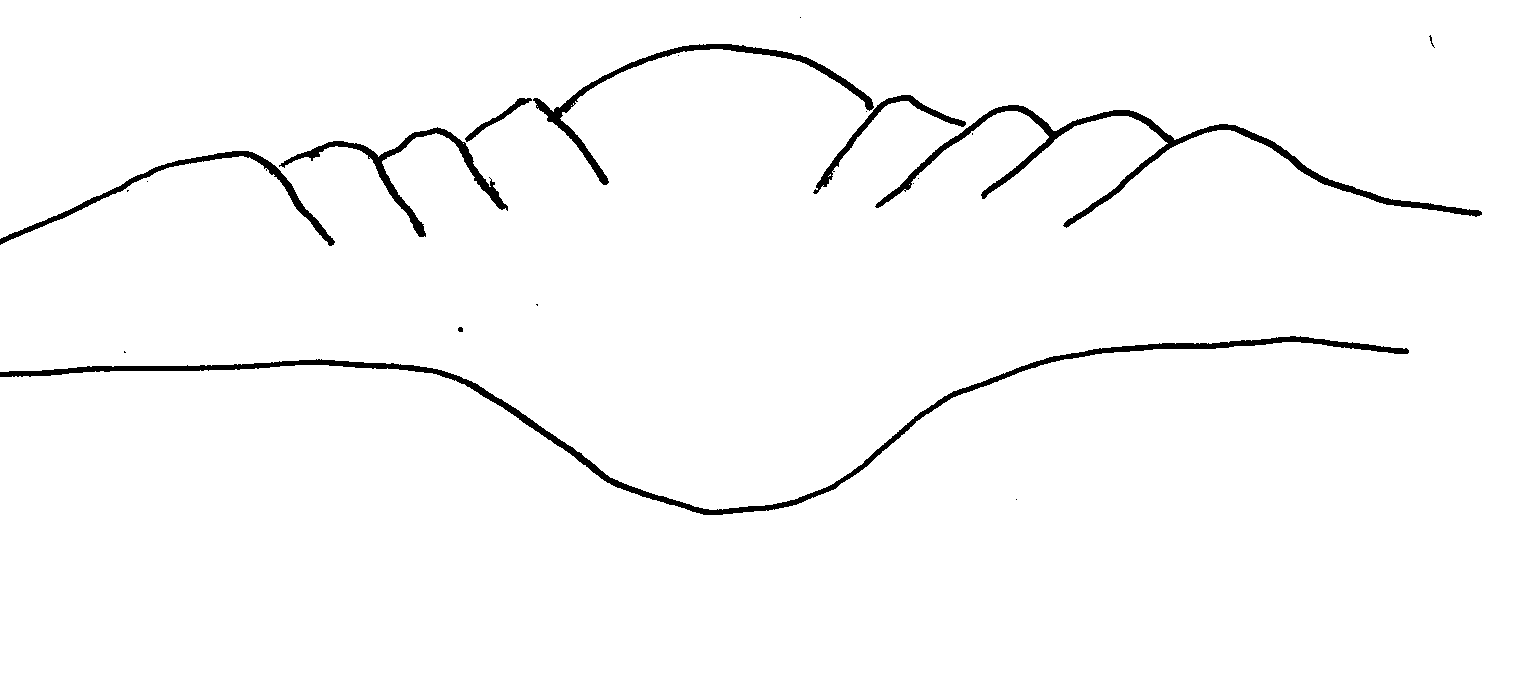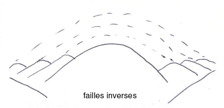 Par contre s’il y a directement de la compression, un bombement continental en résulte accompagné de l’apparition de 2 failles inverses. Dans ce cas il n’y a pas d’effondrement donc pas de transgression océanique et pas de dépôt de sédiments. Ce scénario donne plutôt naissance à des chaînes à double vergence. Ce sont des chaînes de montagnes intracontinentales.