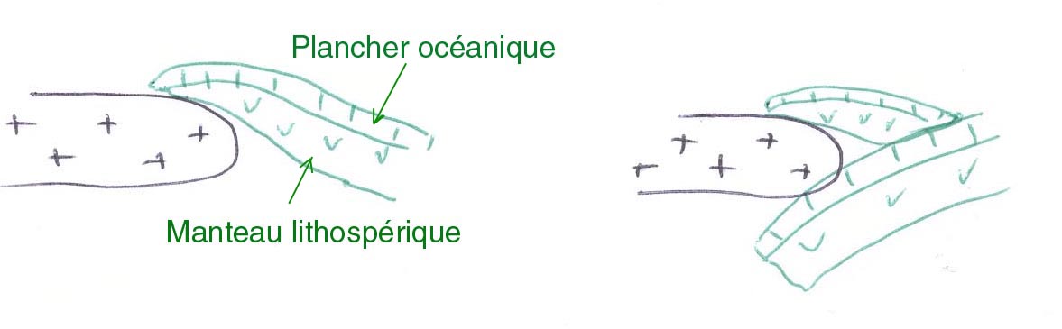 Quand le plancher océanique s’enfonce de lui-même sous son propre poids sous un autre plancher océanique ou sous un continent, il descend très verticalement, il n’y a donc pas de compression mais apparition d’un volcanisme.