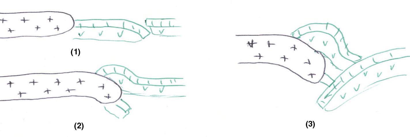 Thétis n’a pas suivi ce scénario car cet océan était trop jeune et le plancher pas assez lourd. La subduction se fait avec un angle beaucoup plus faible, il y a donc plus de frottement et de compression à l’interface océan continent: il y a même de l’érosion de la plaque continentale par le dessous. Dans ce cas il n’y a pas de volcanisme associé et les sédiments vont en profondeur.