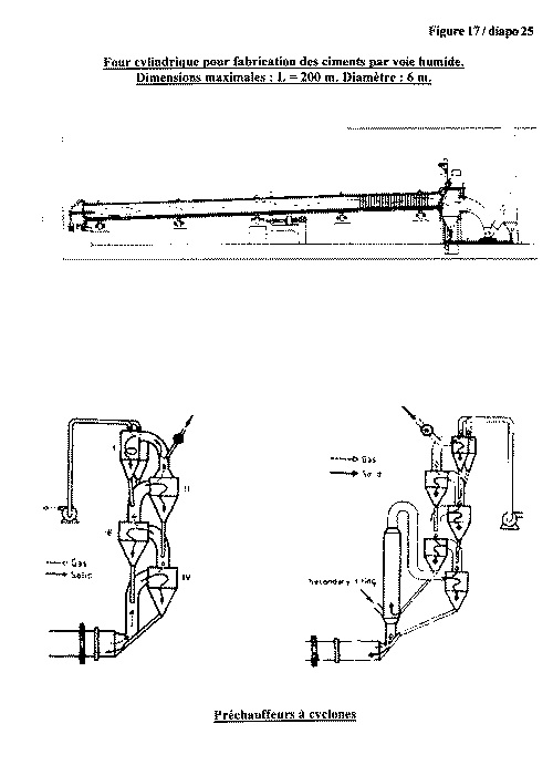 Mais la cuisson des ciments à prise lente a rapidement nécessité des fours susceptibles d'atteindre des températures bien plus élevées :1350-1450°C., voire davantage. Les appareils choisis était dans la plupart des cas des fours rotatifs cylindriques pouvant atteindre de très grandes longueurs (jusqu'à 200 mètres) et normalement divisés en trois sections (Figure 17 a ) : une section de déshydratation, située en amont du four, du côté recevant le cru sous forme de bouillie ou de granules humides, circulant à contre-courant des gaz chauds issus du foyer; une section de décarbonatation chauffée à des températures de l'ordre de 900-950°C. permettant la transformation des calcaires en chaux; une section située à l'approche du foyer pouvant atteindre les températures de 1350-1450°C. nécessaires à la combinaison de la chaux et des matières siliceuses. Il va de soi que cette dernière section devait être revêtue intérieurement de briques réfractaires pour protéger l'enveloppe métallique du four. La construction et la maintenance de tels monstres représentaient évidemment des coûts extrêmement élevés. Les fours de cuisson par voie sèche sont conçus d'une tout autre manière (Figure 17b) .