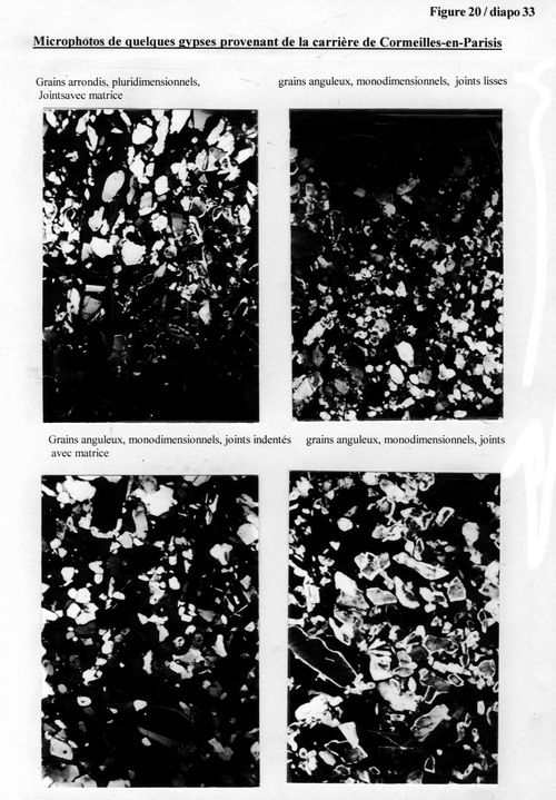 Il demeure cependant que la connaissance des gypses est encore loin de pouvoir préciser les relations entre propriétés de la matière première et les caractéristiques des plâtres. Une étude théorique a été entreprise à ce sujet de 1970 à 1973 par le laboratoire de recherche de la Société Lambert Industries ( 4). Elle portait principalement sur les gypses de la carrière de Cormeilles-en-Parisis et accessoirement sur ceux de la région de Vaujours. Le site de Cormeilles, exploité depuis plus de deux siècles et mondialement connu avait fait l'objet d'une étude géologique effectuée par R. Soyer en 1939. On y avait été reconnu quatre masses de gypse séparées par des marnes . La première masse, de 16,84 m. de puissance comportait 36 couches de
