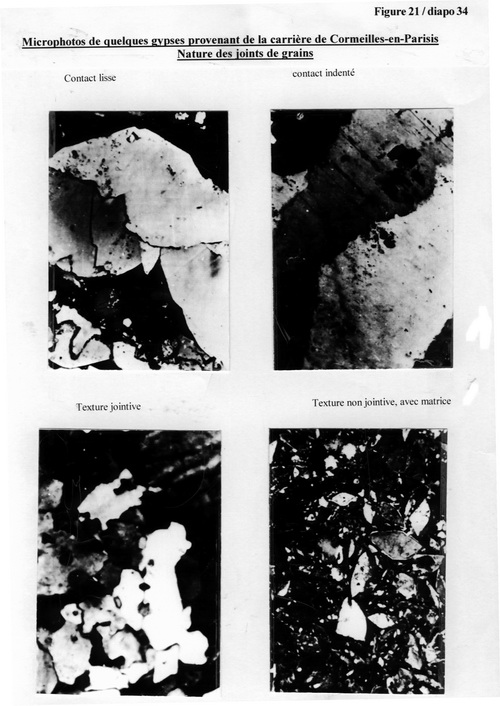 textures différentes la deuxième masse de 16,19m. de puissance comportait 38 couches. Les troisième et quatrième masses, respectivement épaisses de 2,54 m. et de 0,30 m. étaient considérées comme peu intéressantes pour l'industrie plâtrière. Lors de la reprise de l'étude en 1970, les deux premières masses ont été largement échantillonnées, de manière à pouvoir effectuer de nombreux essais physico-chimiques et des essais decuisson en unité pilote. Les observations de Soyer ont été confirmées et des échantillons de chaque couche ont été prélevés. Il ne peut naturellement être question de rendre compte de la totalité des résultats de cette étude, mais il en résulte que l'examen de la texture des échantillons a mis en évidence des différences pétrographiques importantes portant sur la forme des grains constituant la roche ( grains arrondis ou anguleux, cristaux définis), sur les dimensions des grains et leur répartition granulométrique, sur la nature des joints ( Figures 20, 21) .