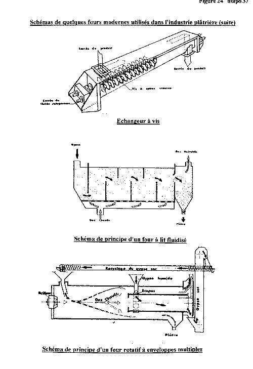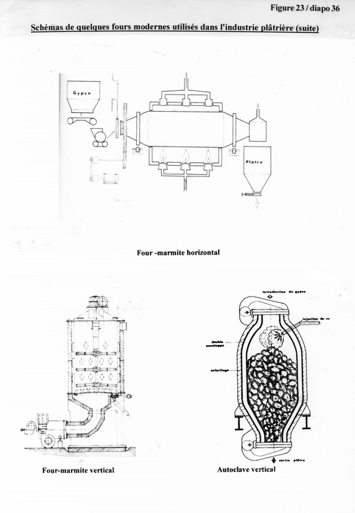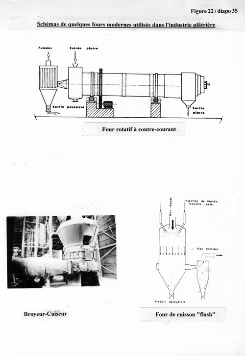 Au cours du dernier siècle et plus particulièrement depuis la fin de la seconde guerre mondiale, le nombreuses méthodes de cuisson ont été développées pour résoudre le problème de la qualité des plâtre, qui repose sur des critères physiques, alors que la qualité de ciments repose sur des critères essentiellement chimiques. Les Figures 22, 23, 24 ) montrent quelques-uns des procédés utilisés depuis une cinquantaine d'années par l'industrie plâtrière. On y trouve aussi bien des appareils discontinus cuisant par "charge" que des fours à alimentation continue.