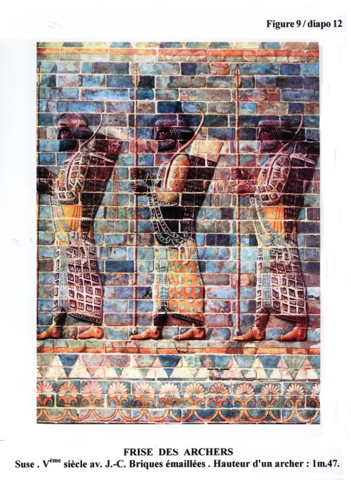 calcaire, en albâtre gypseux ou quelquefois en grès (figures 6, 7, 8), ces civilisations ont introduit l'utilisation de briques liées au bitume et l'emploi de briques recouvertes d'émaux céramiques destinées à la réalisation d'éléments monumentaux de décoration. La " frise des archers" (figure 9) élevée à Suse au Vème siècle avant J.C. en constitue un exemple célèbre.